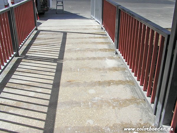 Fußgängersteegbrücke vorher Fußgängersteegbrücke vorher Fußgängersteegbrücke vorher Fußgängersteegbrücke vorher Detailaufnahme der verschlissenen Oberfläche der Fußgängersteegbrücke Fußgängersteegbrücke nachher mit einer rutschhemmenden Bodenbeschichtung Fußgängersteegbrücke nachher mit einer rutschhemmenden Bodenbeschichtung